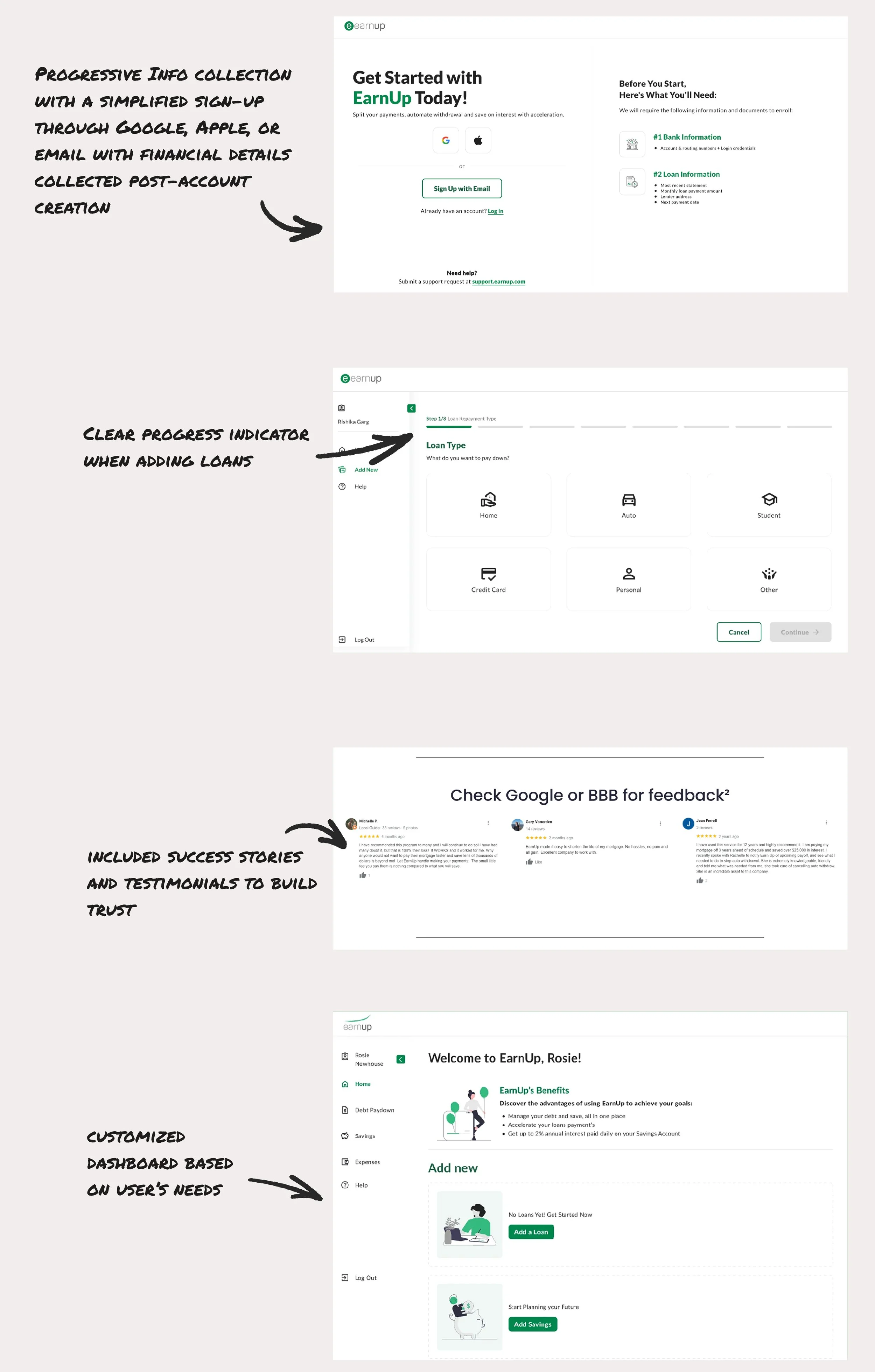 This project taught me that the most impactful design changes are about simplification and creating flows that feel intuitive. While EarnUp needed comprehensive user information for their service to work, the key was finding the right moment to ask for it. By focusing on building trust first and collecting information progressively, I created a more human-centered experience that ultimately served both users and business goals.